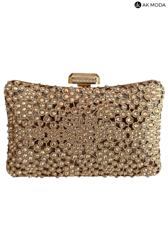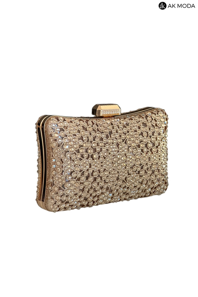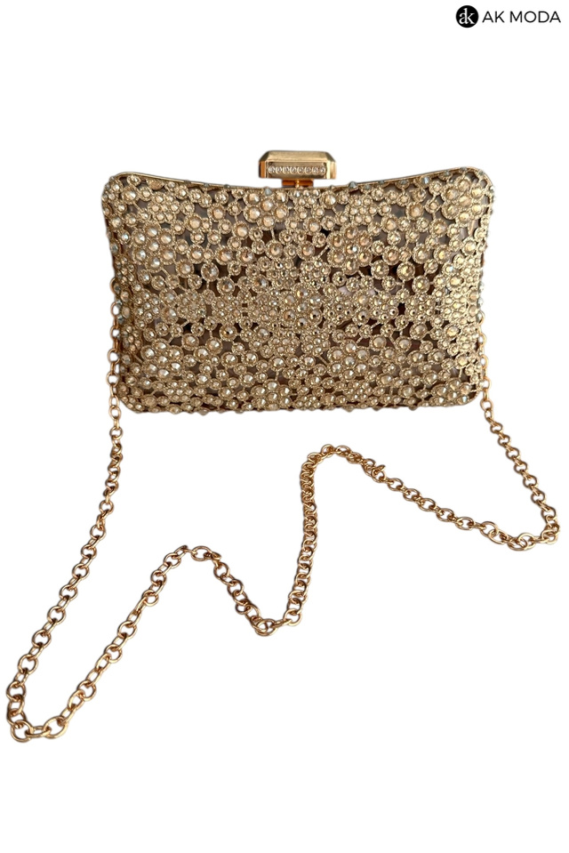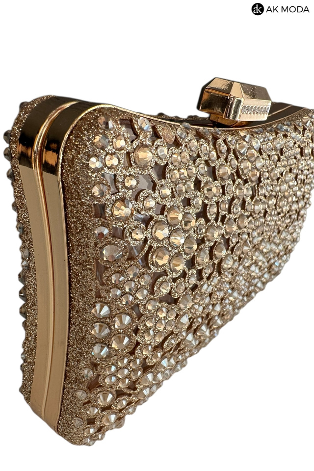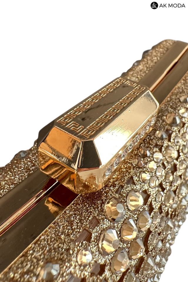 Elegancka torebka typu puzderko w kolorze złotym, z ozdobnym zapięciem na zatrzask. Torebka posiada odpinany łańcuszek oraz uchwyt, dzięki czemu można ją nosić zarówno w dłoni, jak i na ramieniu. Puzderko wykonane z przezroczystego materiału, wysadzanego kamyczkami i brokatem.