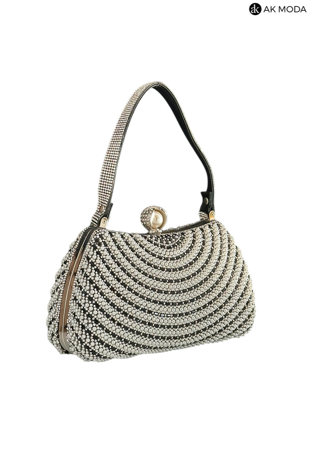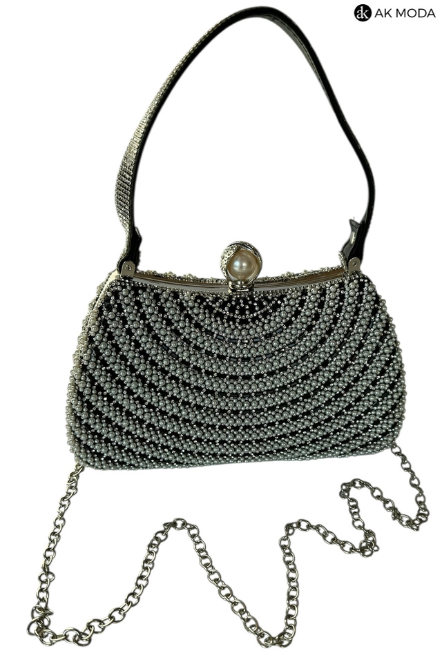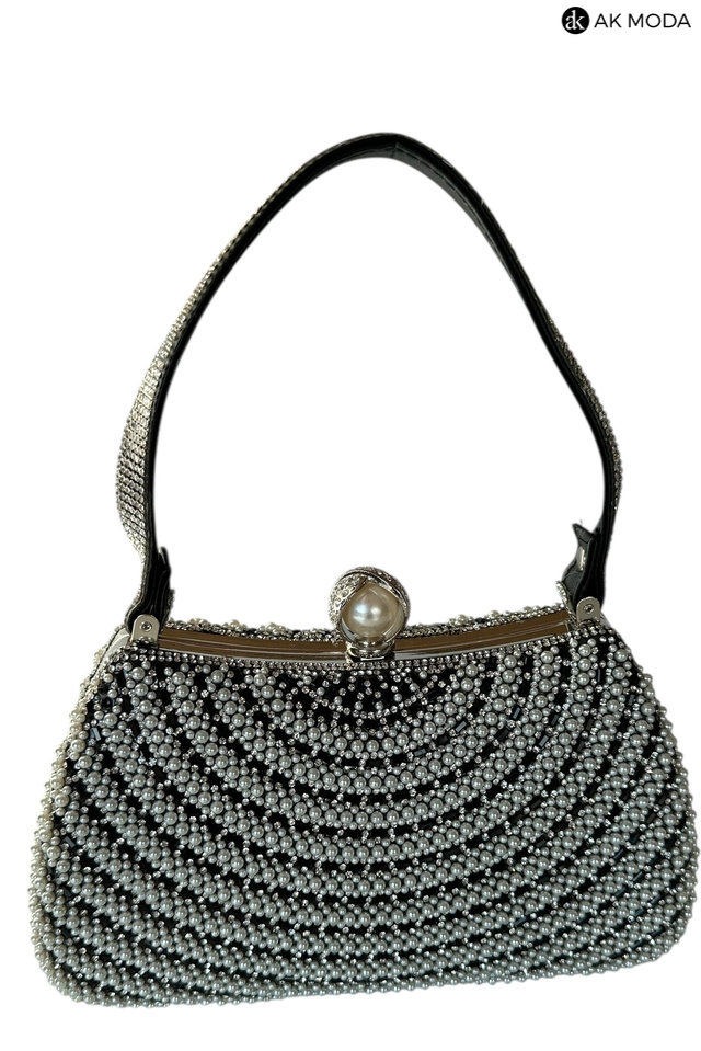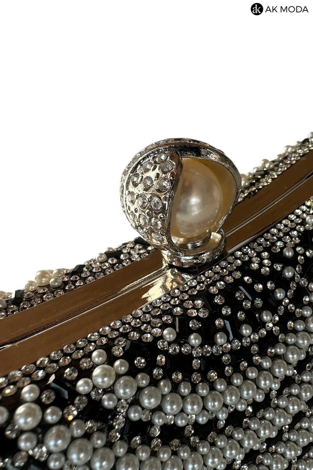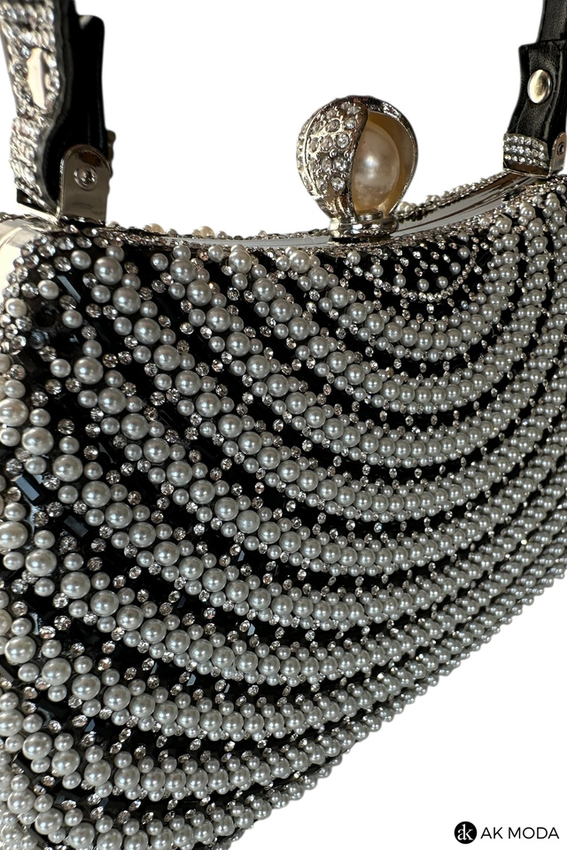 Elegancka torebka typu puzderko w kolorze czarnym, z zapięciem na zatrzask i ozdobnym krótkim paskiem. Torebka posiada odpinany długi łańcuszek, dzięki czemu można ją nosić zarówno w dłoni, jak i na ramieniu. Puzderko w całości zdobione perełkami i cyrkoniami.