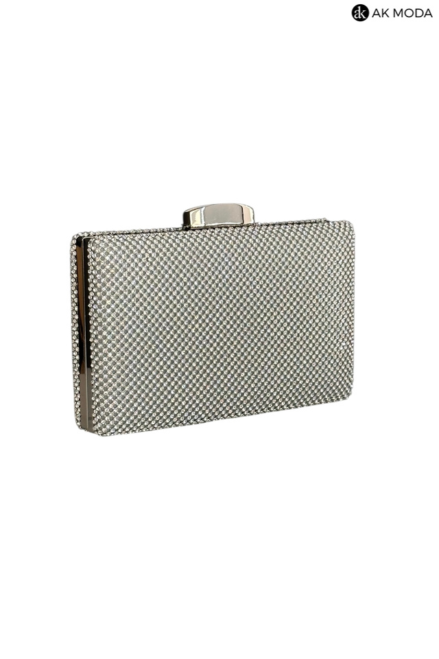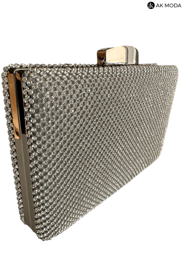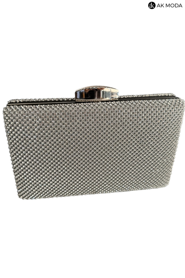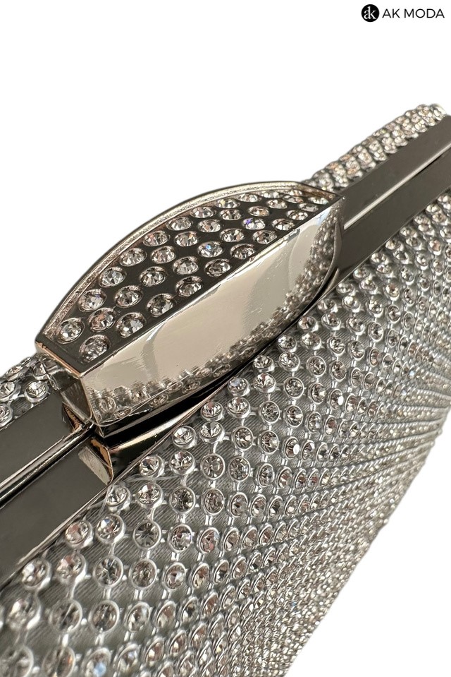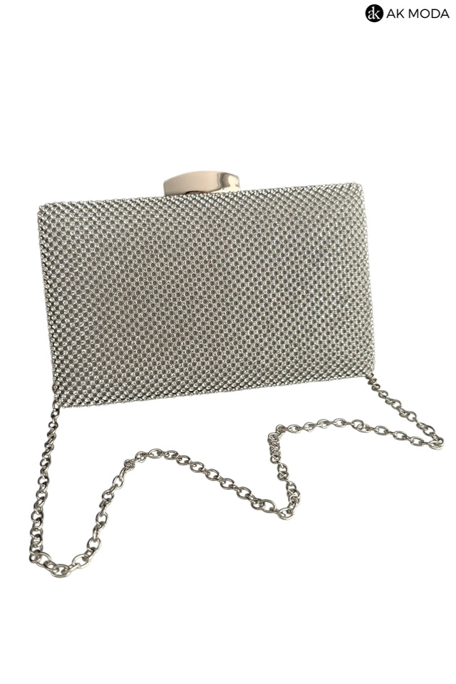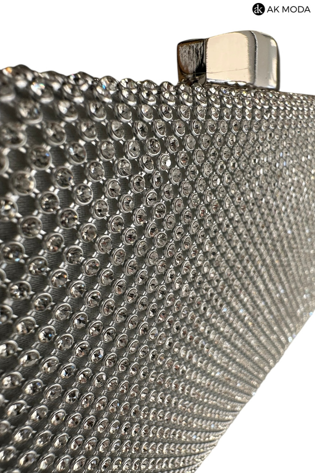 Elegancka torebka typu puzderko w kolorze srebrnym z ozdobnym zapięciem. Torebka posiada odpinany długi łańcuszek, oraz ozdobny uchwyt, dzięki czemu można ją nosić zarówno w dłoni, jak i na ramieniu. Puzderko w całości wysadzane błyszczącymi cyrkoniami.
