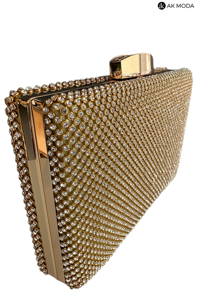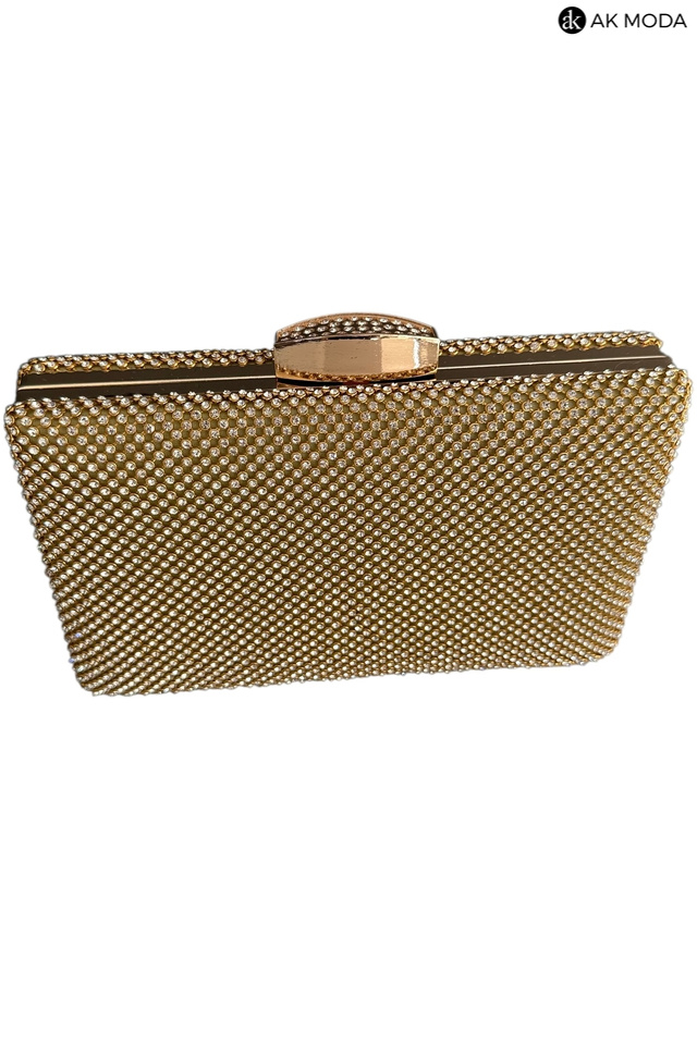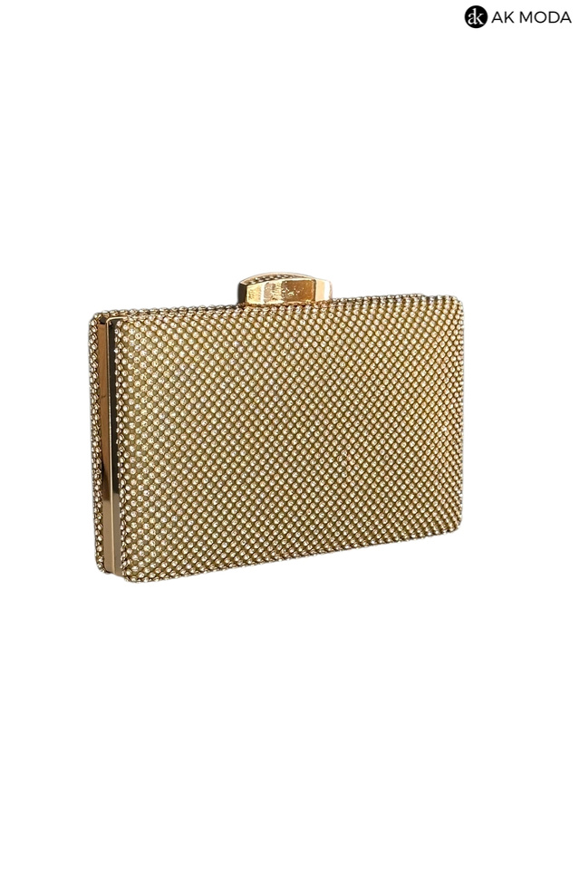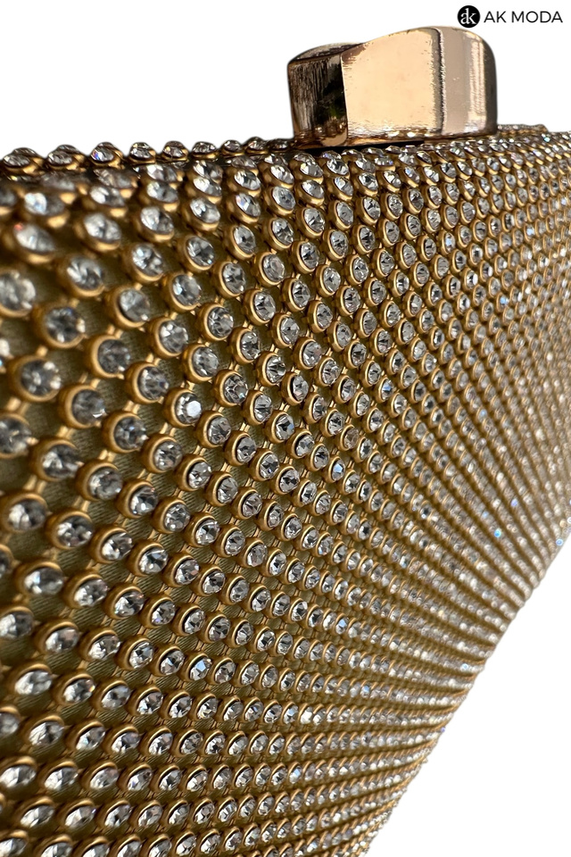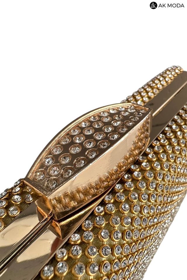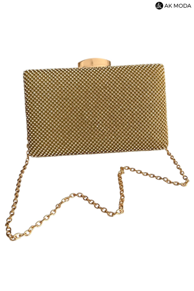 Elegancka torebka typu puzderko w kolorze złotym z ozdobnym zapięciem. Torebka posiada odpinany długi łańcuszek, oraz ozdobny uchwyt, dzięki czemu można ją nosić zarówno w dłoni, jak i na ramieniu. Puzderko w całości wysadzane błyszczącymi cyrkoniami.