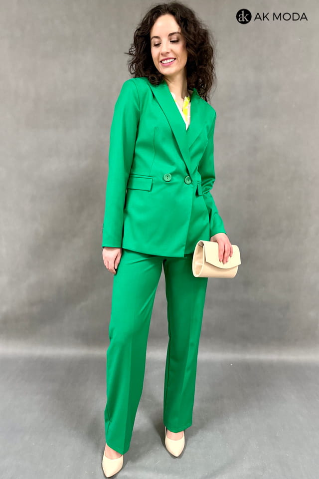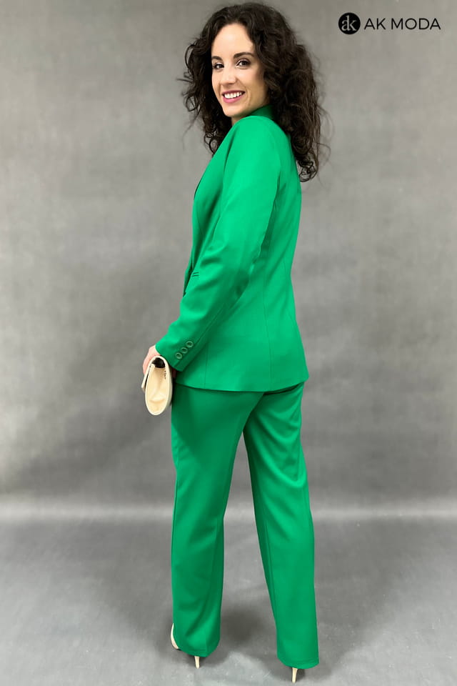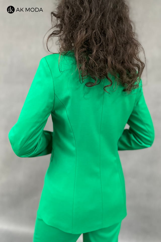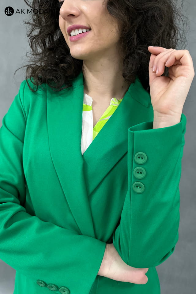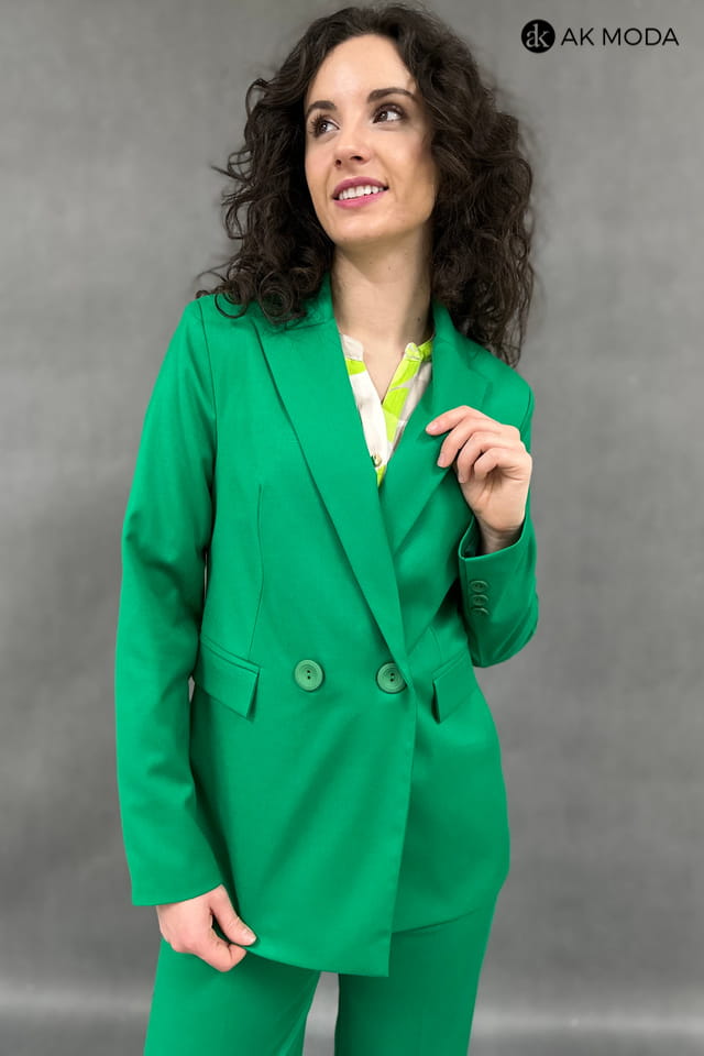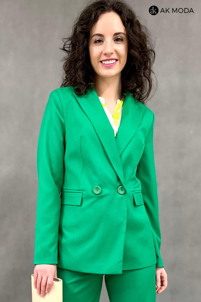 Zielony dwurzędowy żakiet z reweresowym kołnierzem i kieszeniami.