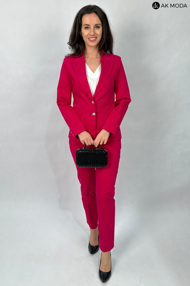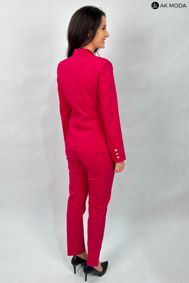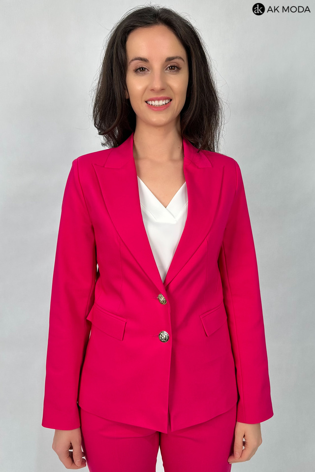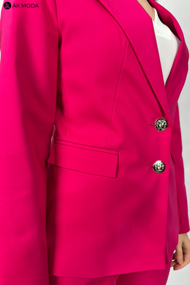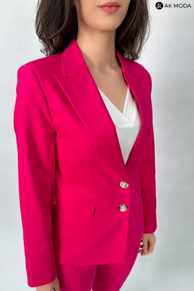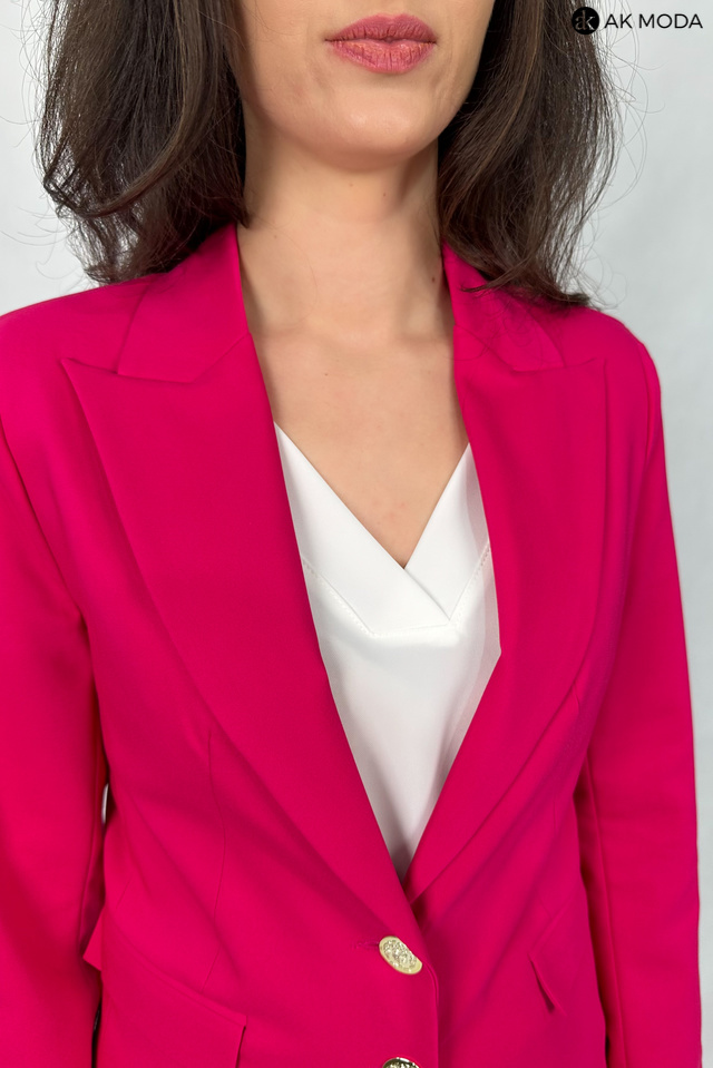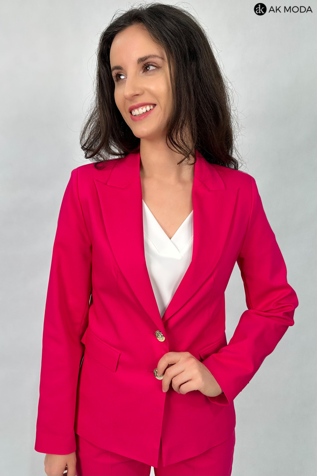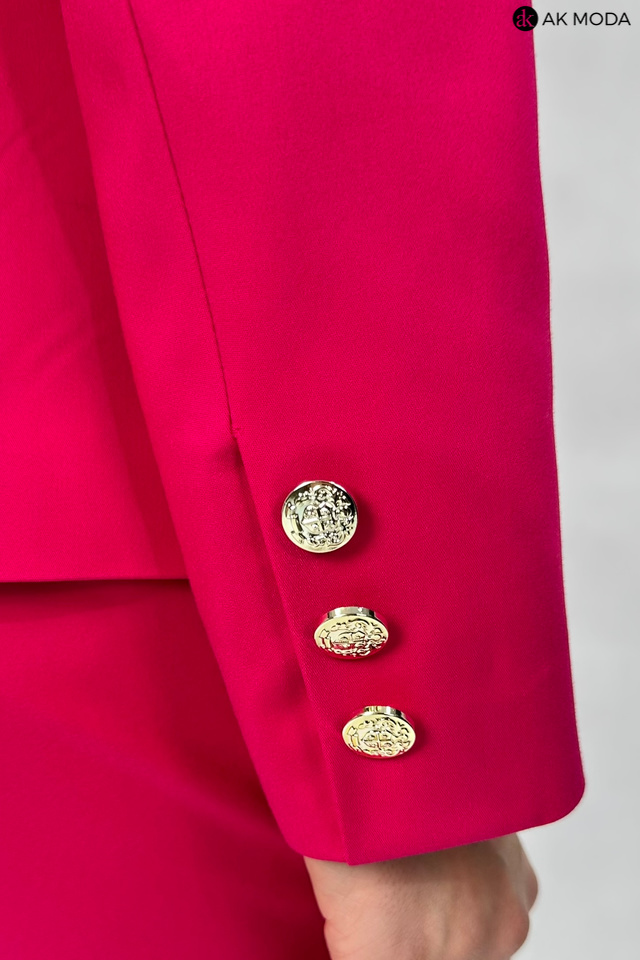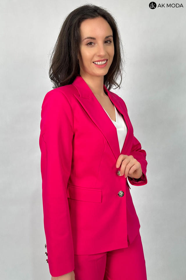 Fuksjowy żakiet z reweresowym kołnierzem i kieszeniami, zapinany na ozdobne guziki.