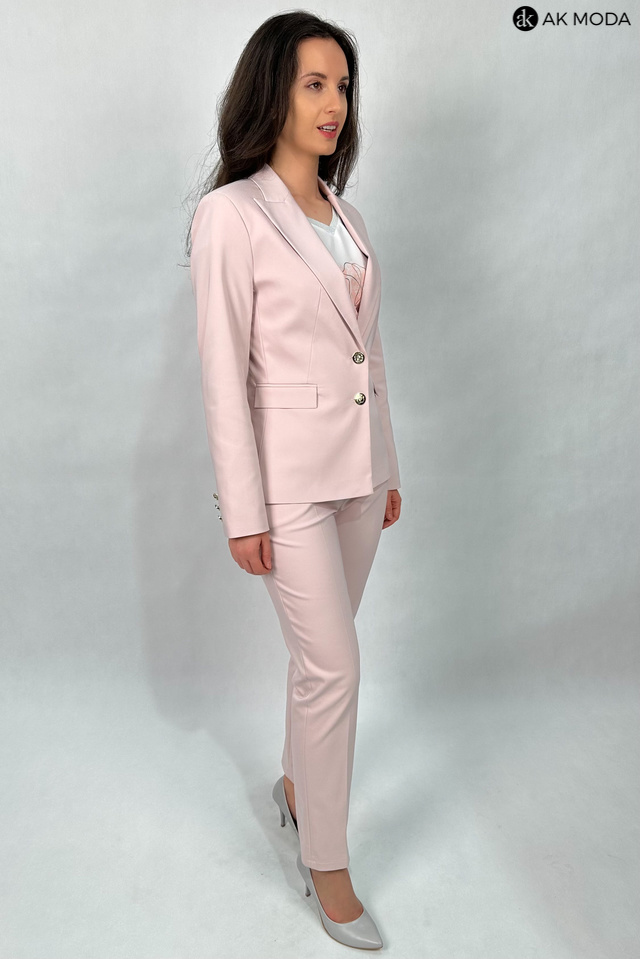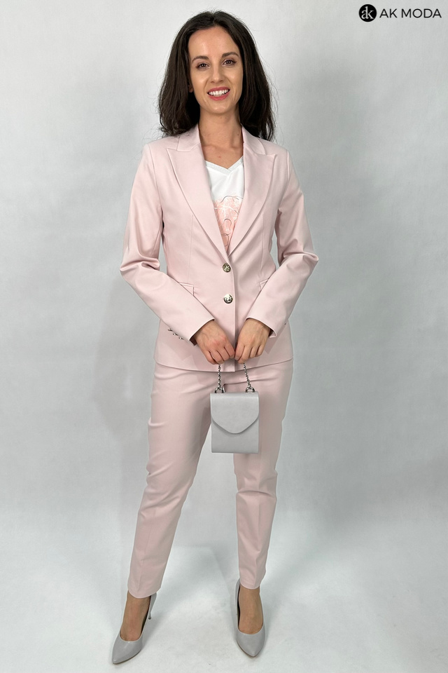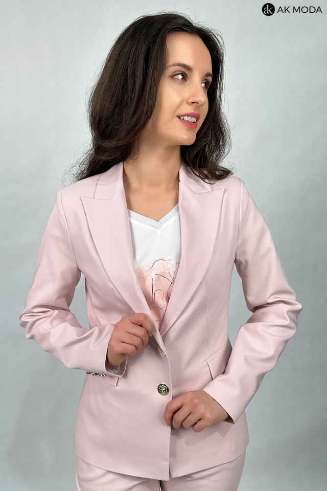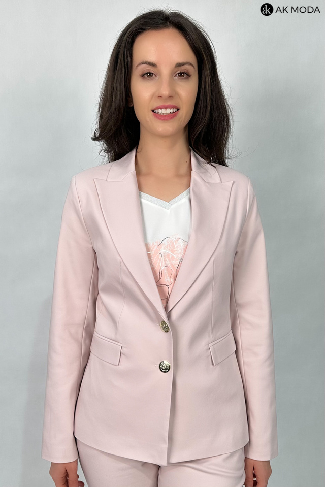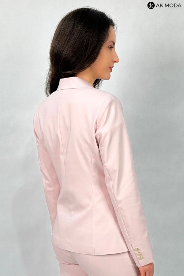 Żakiet w kolorze pudrowego różu z reweresowym kołnierzem i kieszeniami, zapinany na ozdobne guziki.