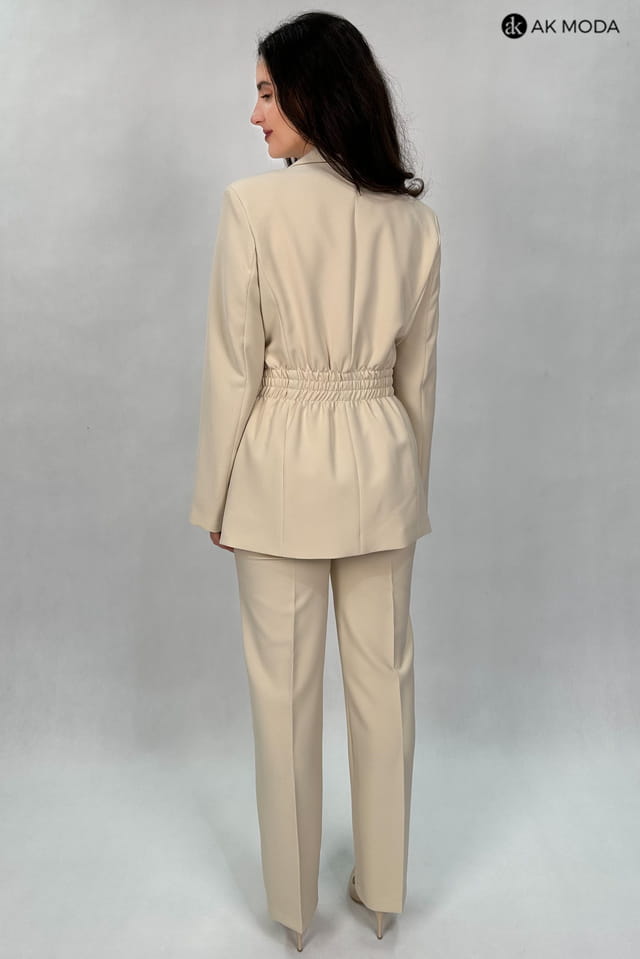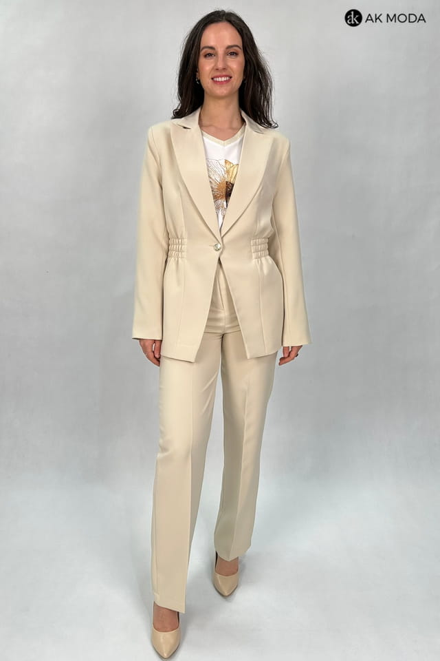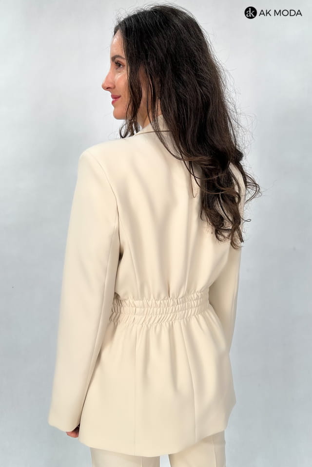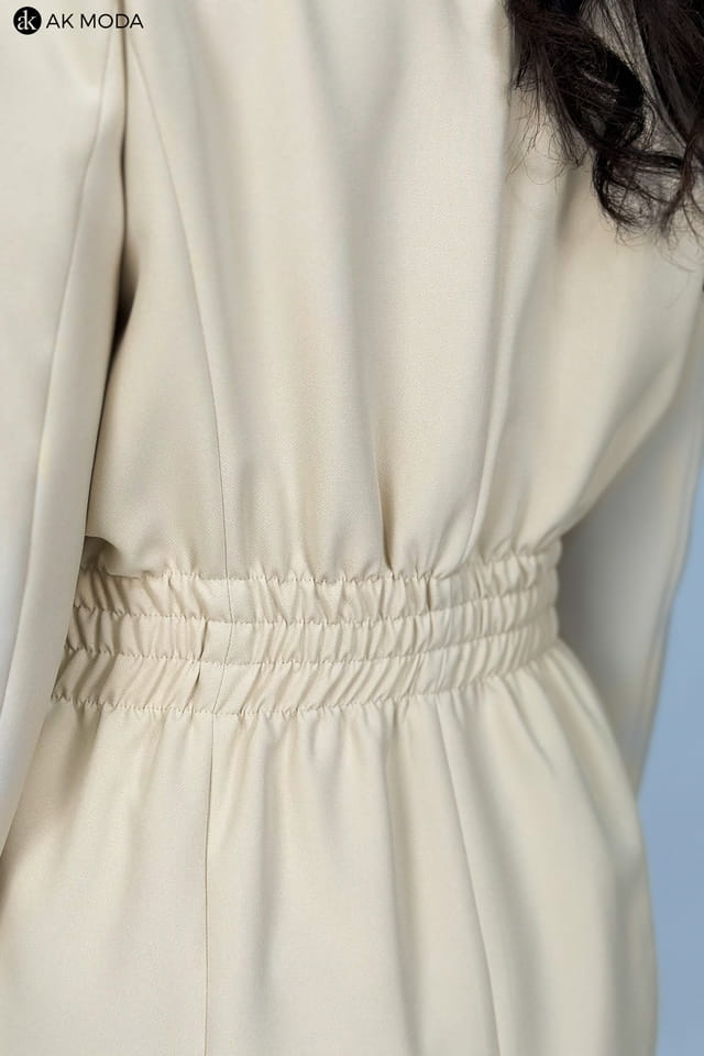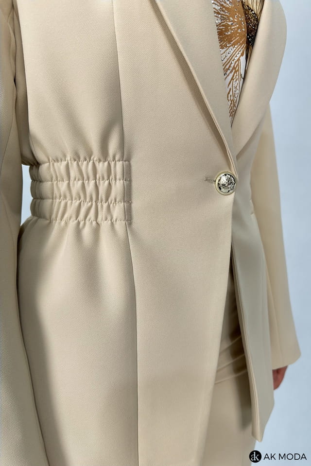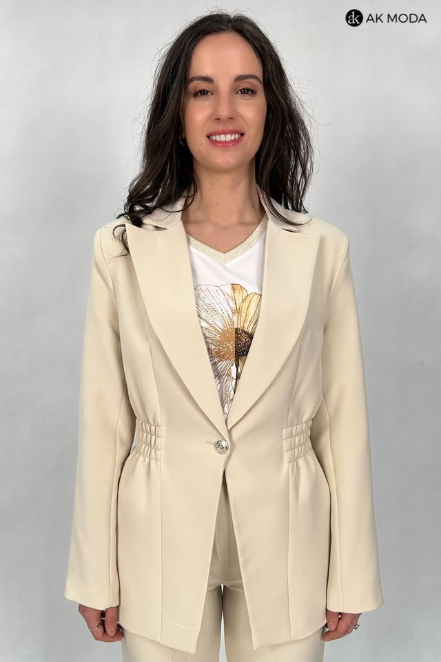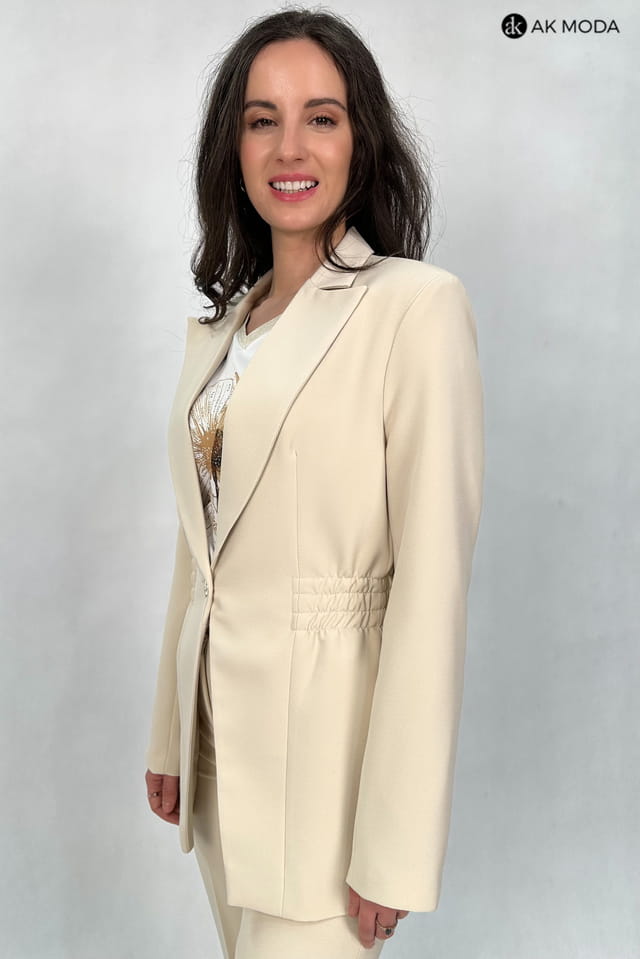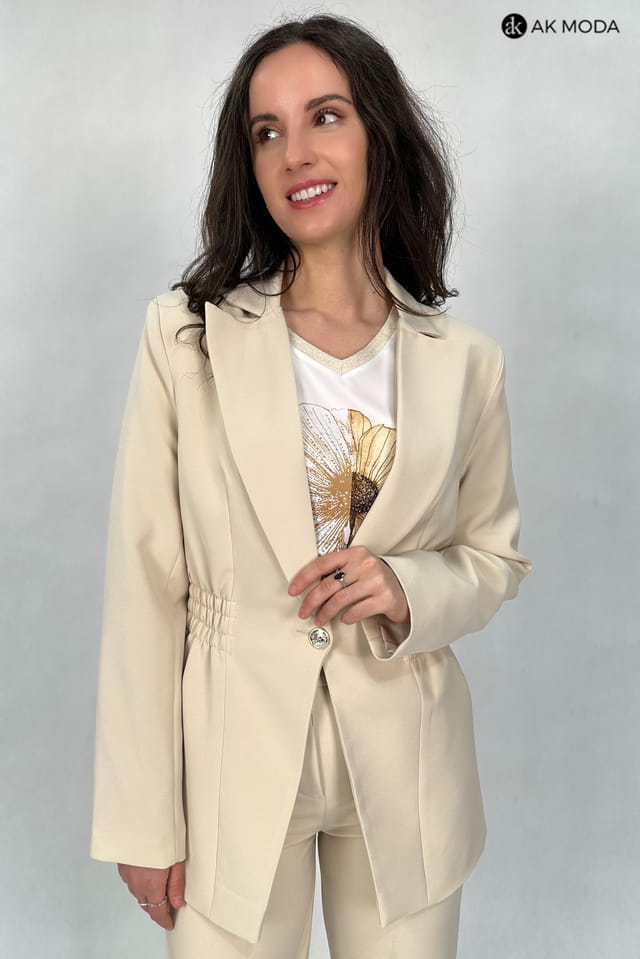 Beżowa marynarka damska o dłużyszm fasonie z rewersowym kołnirzem, zapinana na ozdobny guzik. Model posiada gumki w pasie podkreślające talię.