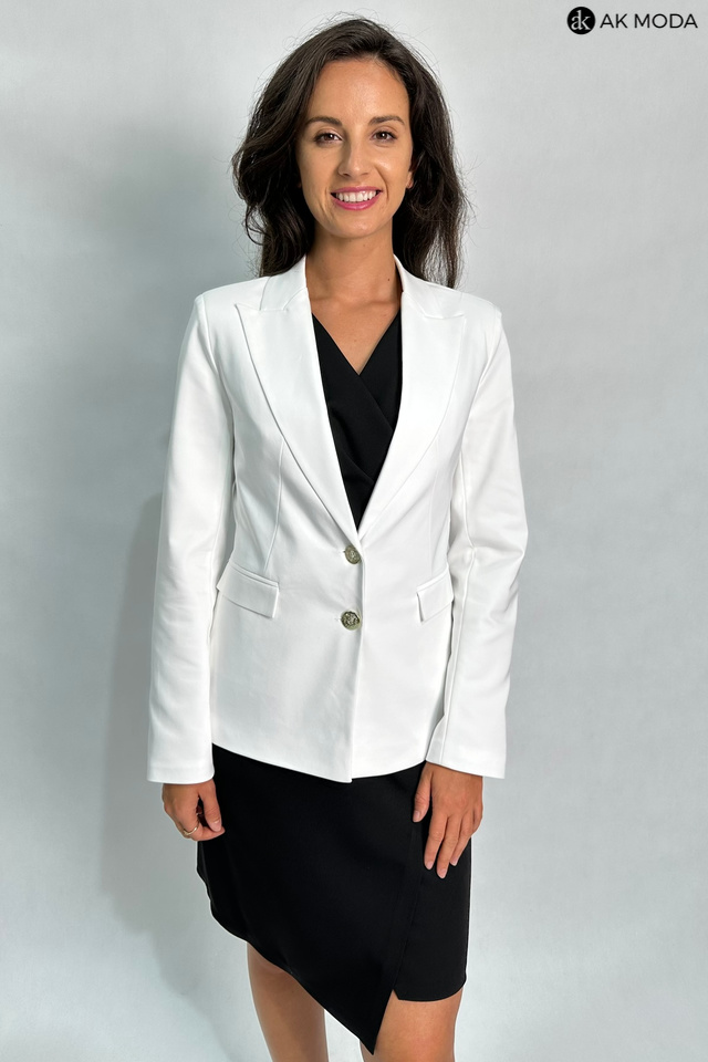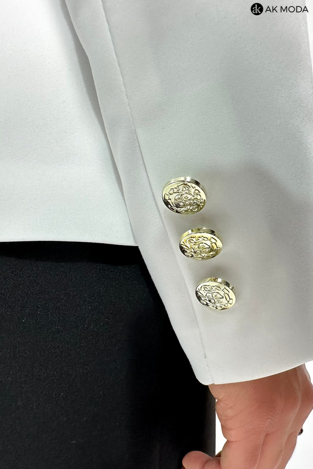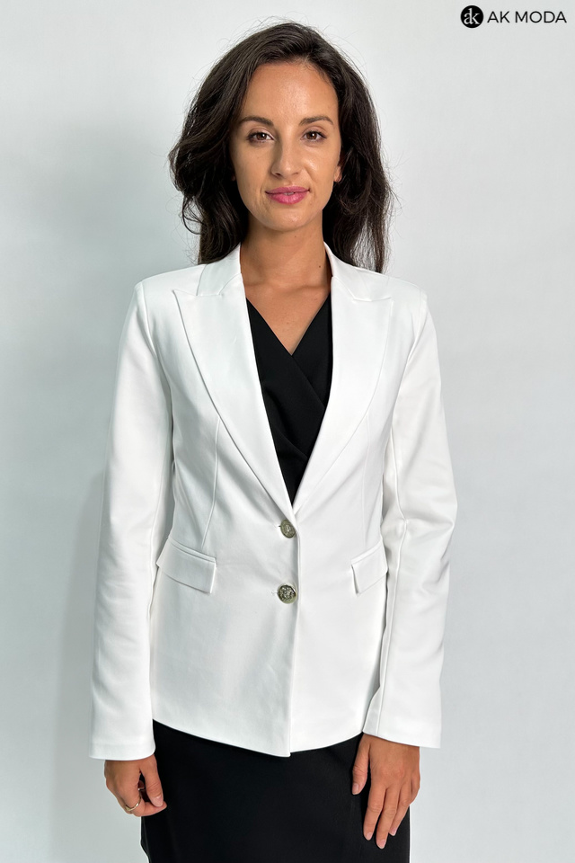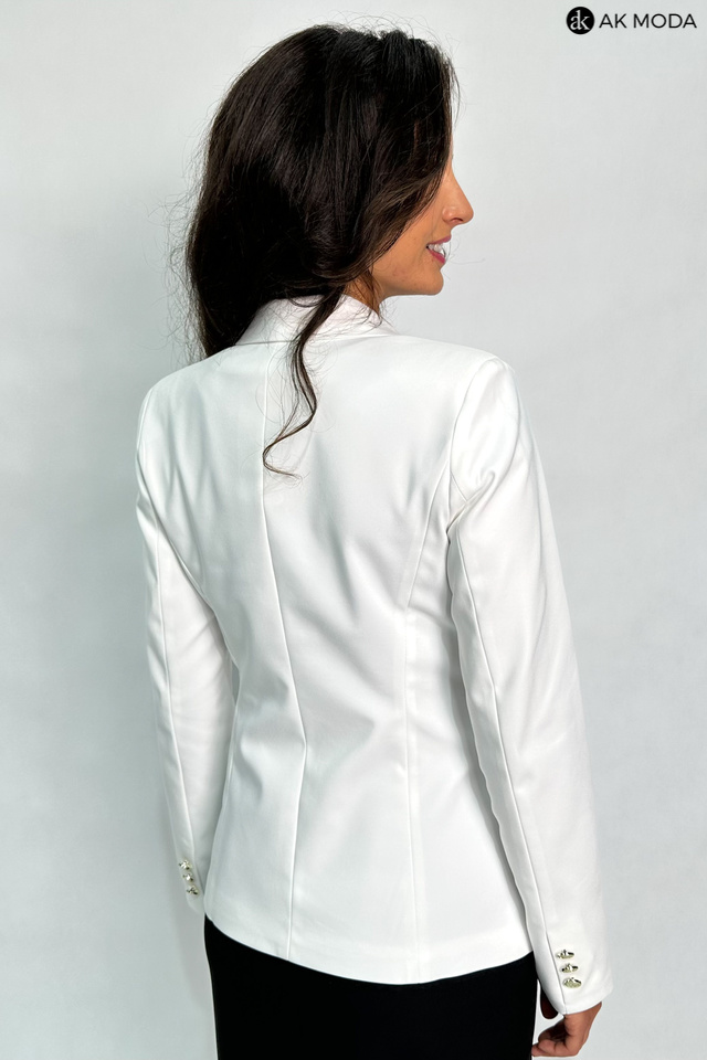Biały żakiet z reweresowym kołnierzem i kieszeniami, zapinany na ozdobne guziki.