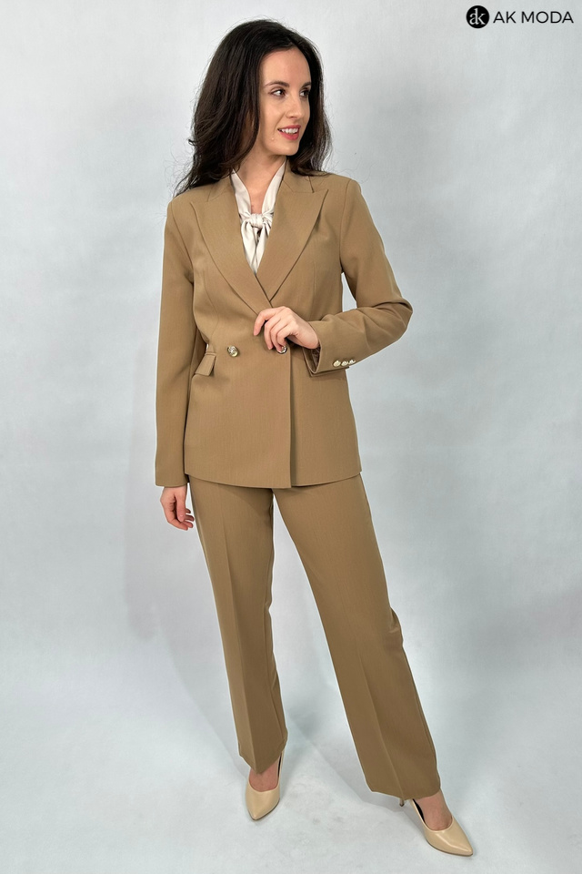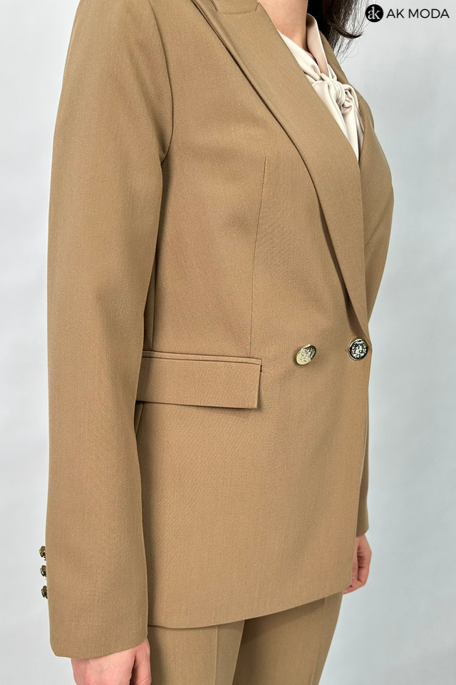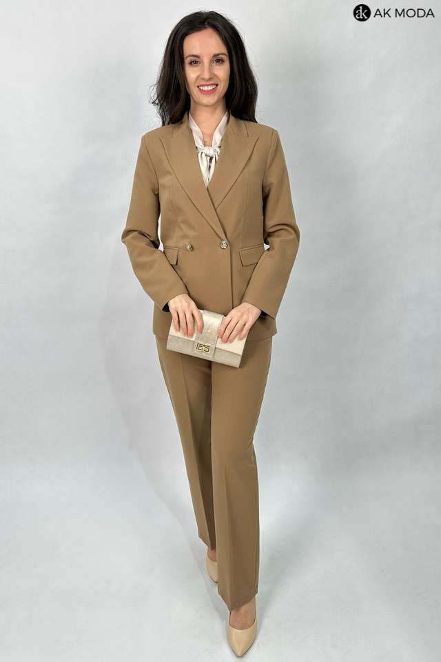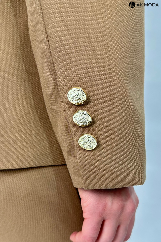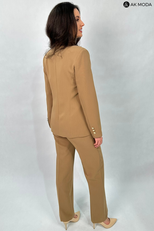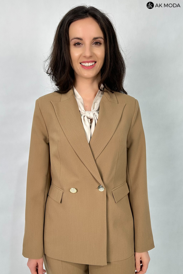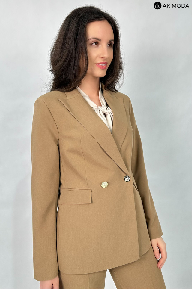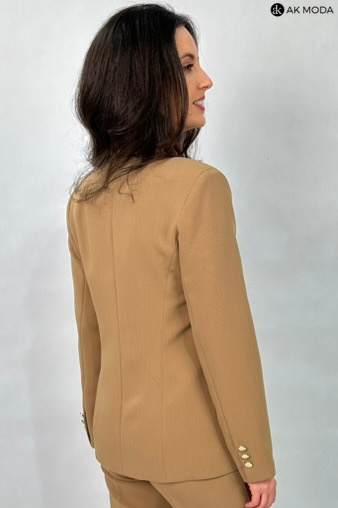 Elegancki, taliowany żakiet w kolorze brązowym, zapinany na ozdobny guzik. Model z klasycznym rewersowym kołnierzem oraz kieszeniami z patkami.